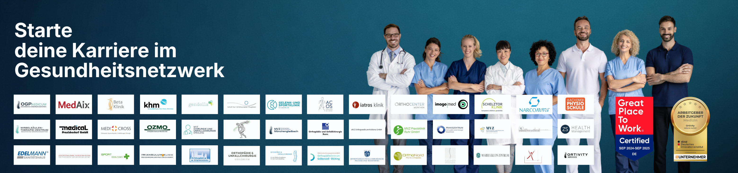 Hier arbeitest du nicht nur in einer Praxis – sondern in einer Gemeinschaft, die deine Fähigkeiten stärkt. Im Ortivity Netzwerk arbeiten über 3.000 Kolleginnen und Kollegen gemeinsam an einer hochwertigen medizinischen Versorgung in ganz Deutschland. Du bist Teil eines starken Teams vor Ort und profitierst gleichzeitig von den Möglichkeiten eines wachsenden, vernetzten Gesundheitsnetzwerks – inklusive vielfältiger Fort- und Weiterbildungsangebote über unsere Ortivity Academy. Entdecke jetzt unsere offenen Stellen und finde die passende Position für dich. Finde den Ort, der zu dir passt. Auf dieser Seite findest du alle offenen Positionen in unserem Netzwerk. Nutze die Filter und entdecke, wo du dich fachlich und persönlich weiterentwickeln möchtest. Wir freuen uns darauf, dich kennenzulernen.